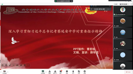薛早成同学从什么是延安精神,如何践行延安精神两方面展开宣讲。王佳婷同学分享了自己在延安中学的学习、生活经历。