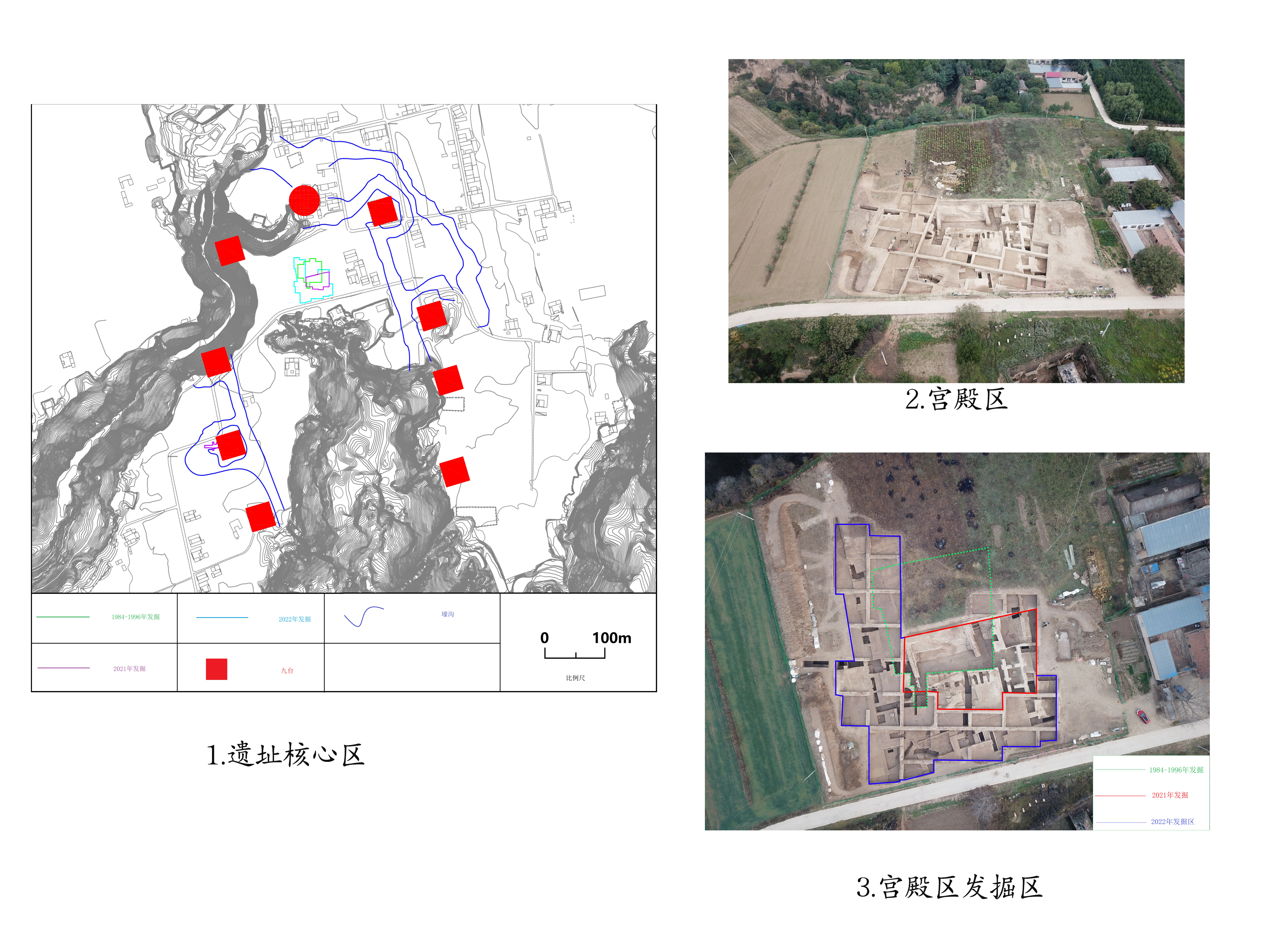 1.发现了由9座夯土台围成的约30万平方米的遗址核心区。核心区外围发现大面积居住区、沟渠等水利设施,形成了一个多圈层聚落结构和体系,对核心区形成“众星捧月”般的拱卫之势,对于认识聚落内部的社会组织结构有重要意义。初步确认遗址面积超过600万平方米,遗址主体分布区230万平方米,核心区30万平方米的遗址核心区。遗址核心区有9座呈倒“U”字形排布的夯土祭台,北台圆形,东西八台方形,各40米见方,有的台残高约5-7米。“九台”外侧有两道环壕。通过解剖发掘,发现夯土台西侧壕沟局部宽约20米、深约10米。