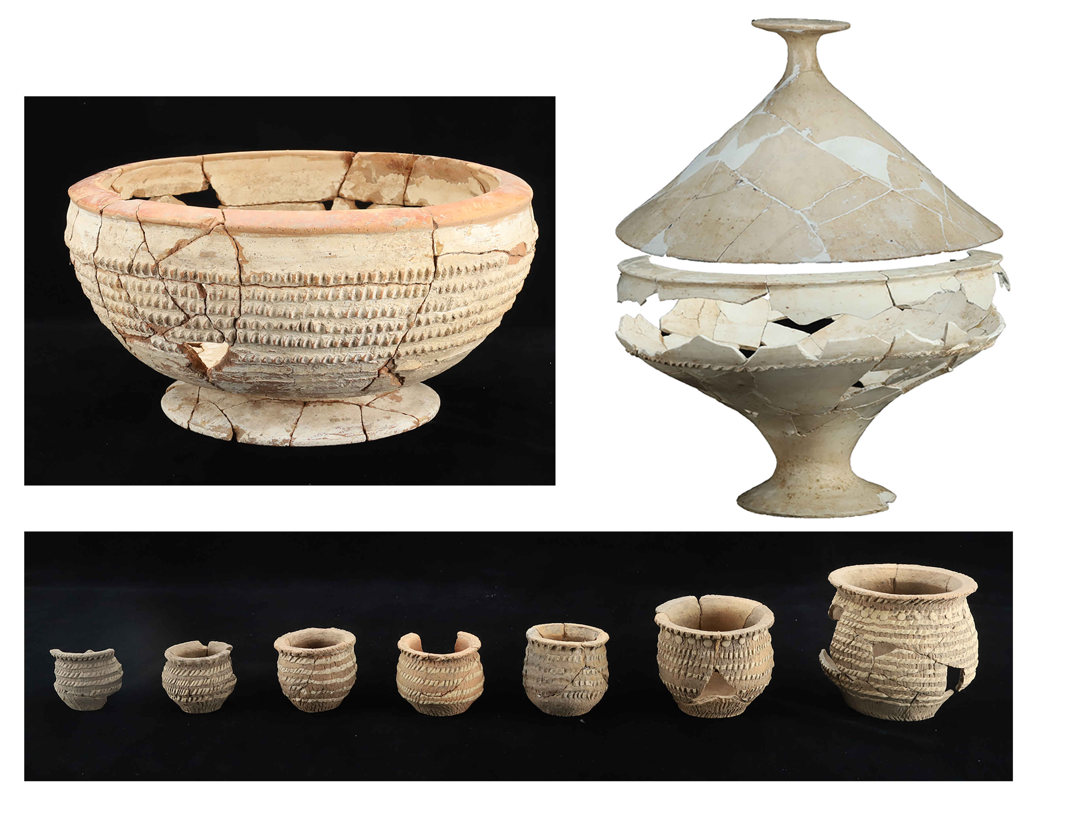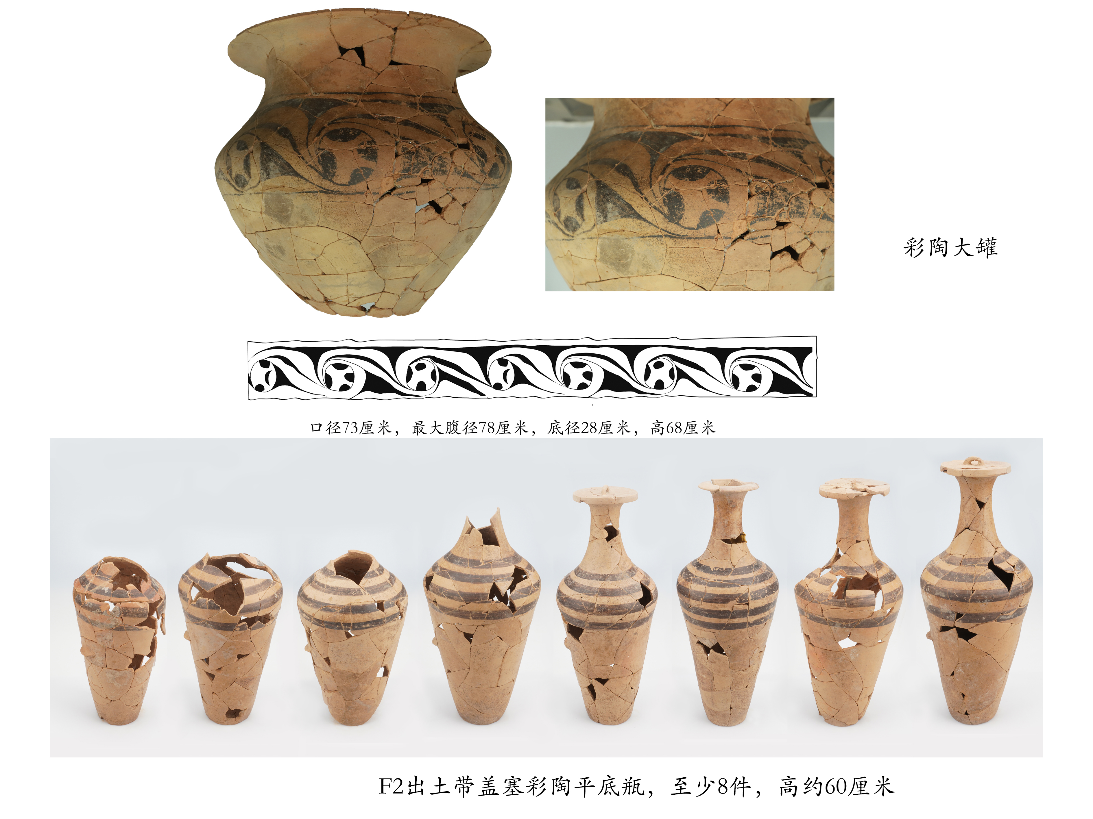 4.在“宫城”出土了大量制作水平高超的高等级陶器。其中在主殿F1东侧的祭祀仪式性空间F2内,出土了数百件大小不一箍白色附加堆纹的小罐,1件带盖白陶簋,9件带盖塞的小口平底彩陶瓶,1件高近70厘米的大型彩陶罐。此外还有白衣陶簋、圜底缸、双腹盆、陶抄、朱砂彩绘陶、黑陶等特殊陶器,还发现较多表面涂朱砂的石镞、骨镞,以及陶塑人像、绿松石,在F1底部和宫殿其他区域还发现了土坯和最早的陶砖等建筑材料。