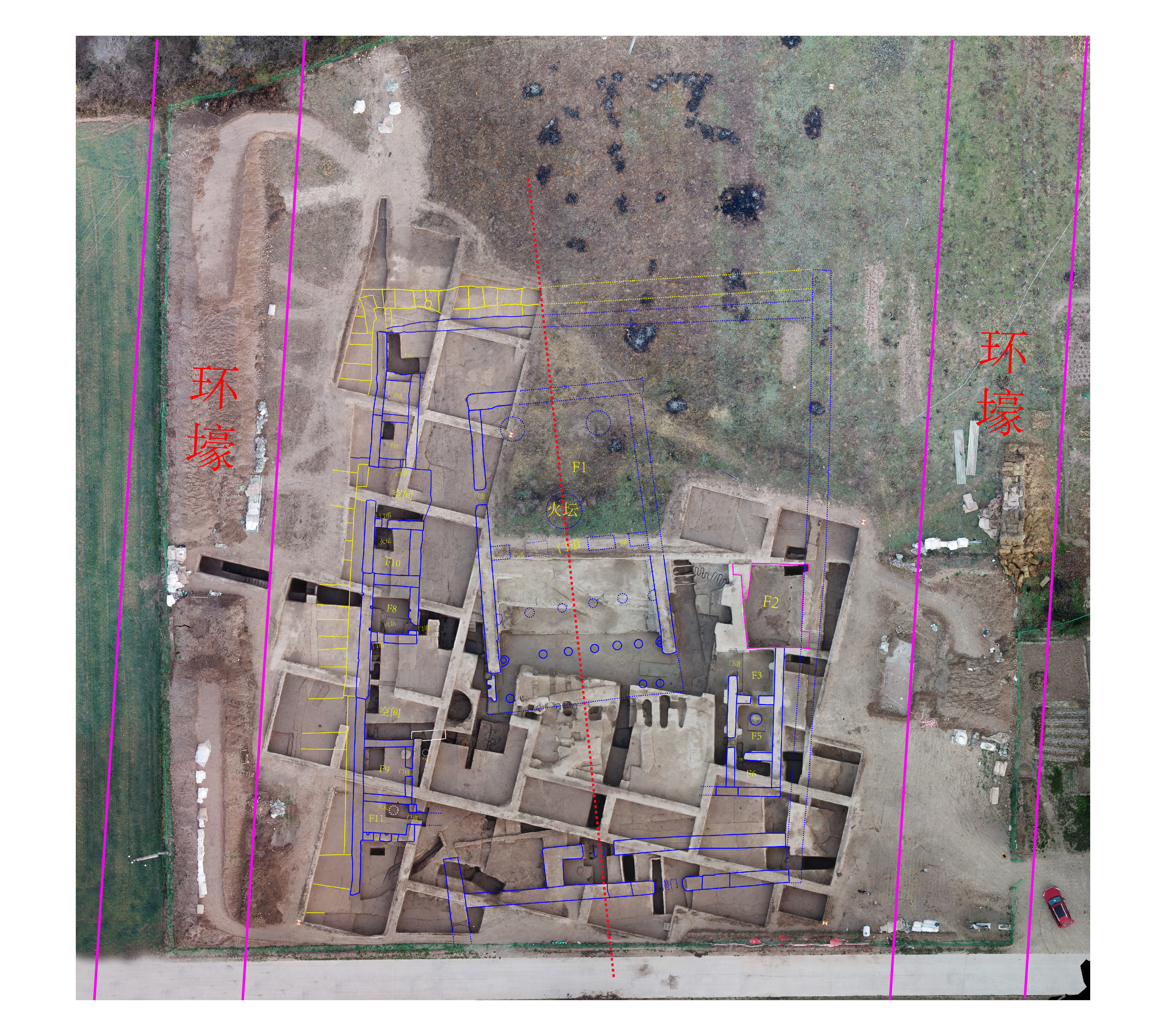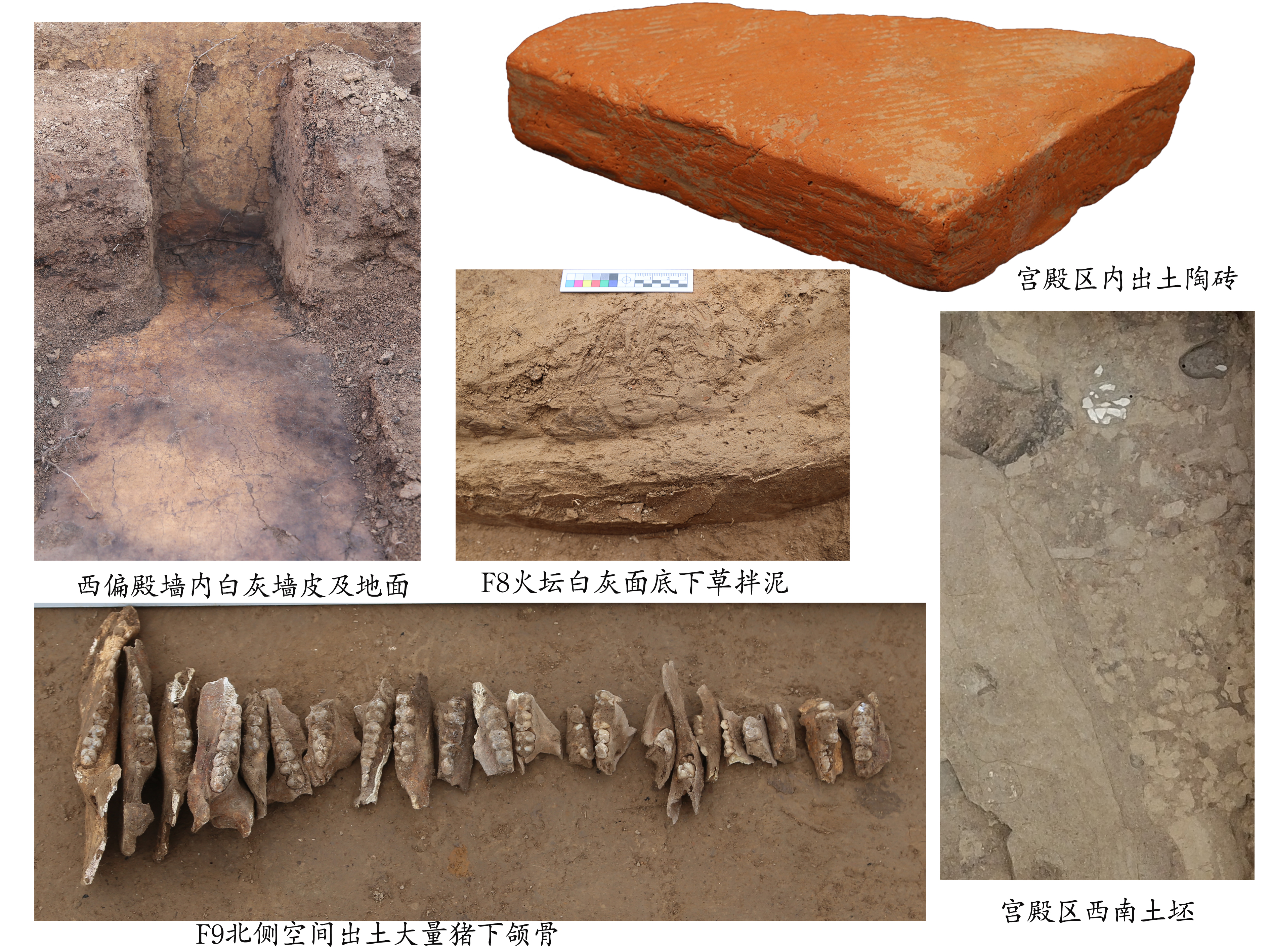 2.发现了年代最早、布局最严整的“宫城”。在“九台”中央偏北发现一座面积3600多平方米的长方形“宫城”,东西宽约55米,南北长约67米,外围有宫墙环绕。宫墙外为大型环壕或“护城河”,宽约15米、深达12.5米,加上“护城河”整个“宫城”有上万平方米。“宫城”以主殿F1为中心,东西两侧分布两排侧室(侧殿),东侧从北往南为F3、F5、F6、F16等,西侧从南至北为F11、F9、F8、F10、F12、F13、F14等。F5、F11、F8、F10、F12地面还发现涂抹白灰的圆形火塘,其中F5火塘直径约1.2米。早期宫殿停止使用后,整个“宫城”区大部分区域被夯填平整。