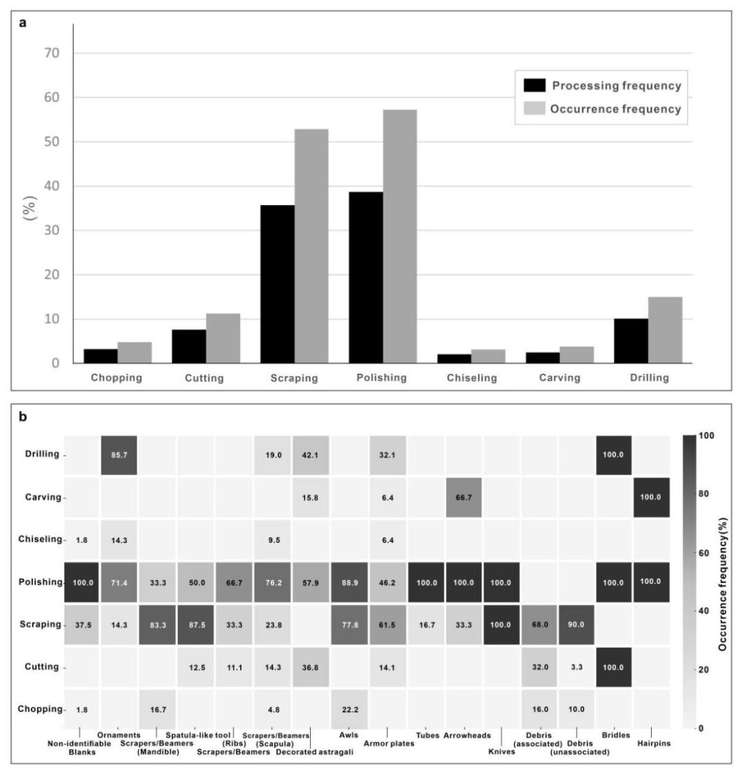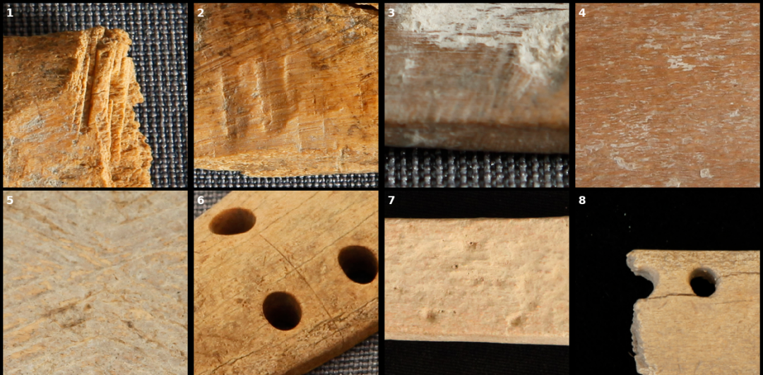 1.切割;2.刮削;3.打磨(未完成);4.打磨(完成)5.雕刻(装饰性);6.雕刻(功能性);7.凿刻;8.钻孔
