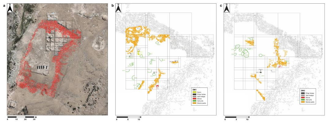 a. IIIF1航拍图 b. 一期使用地面 c. 二期使用地面