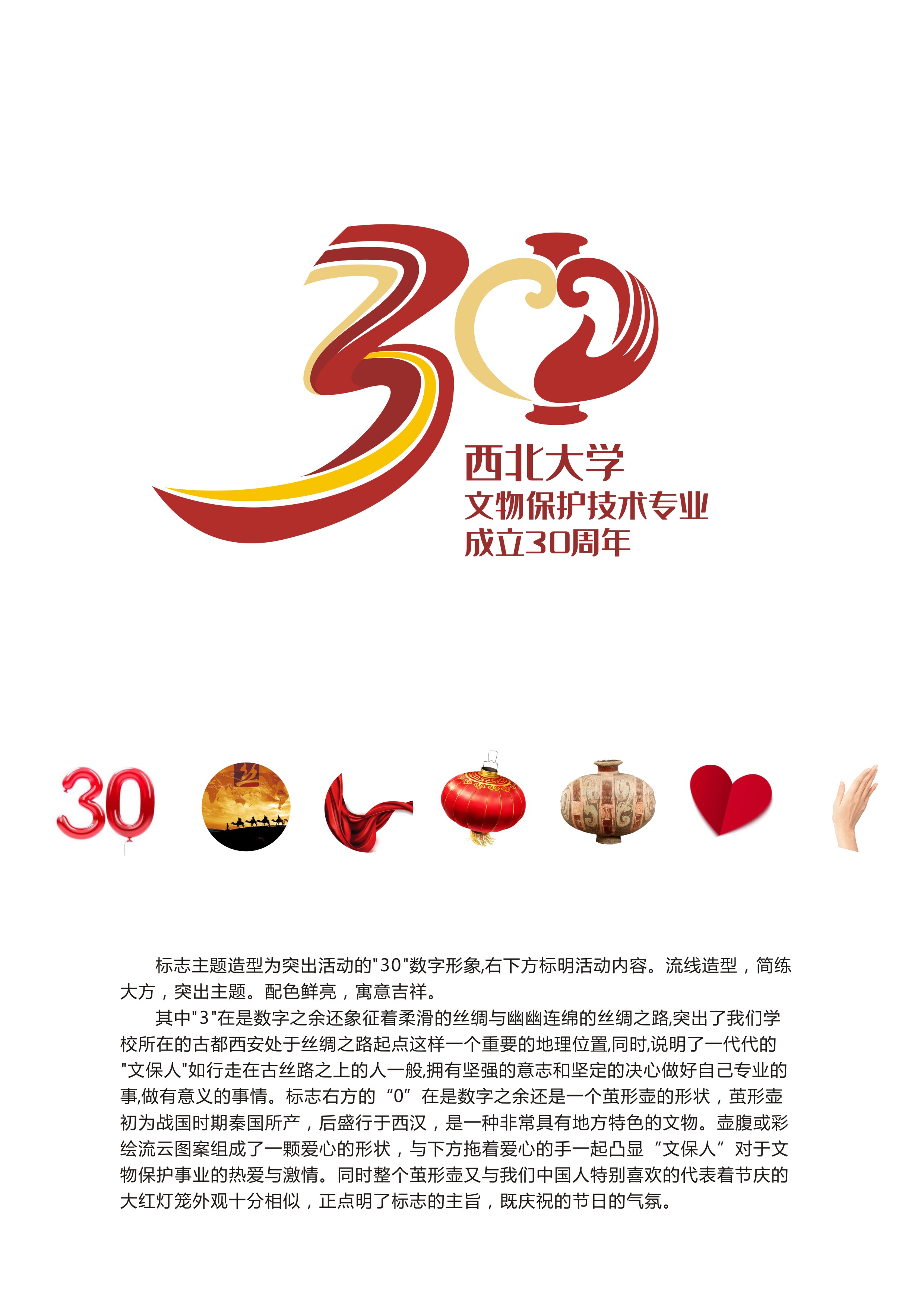 其中"3"在是数字之余还象征着柔滑的丝绸与幽幽连绵的丝绸之路,突出了我们学校所在的古都西安处于丝绸之路起点这样一个重要的地理位置,同时,说明了一代代的"文保人"如行走在古丝路之上的人一般拥有坚强的意志和坚定的决心做好自己专业的事,做有意义的事情。标志右方的"0” 在是数字之余还是一个茧形壶的形状,茧形壶初为战国时期秦国所产,后盛行于西汉,是一-种非常具有地方特色的文物。壶腹或彩绘流云图案组成了一颗爱心的形状,与下方拖着爱心的手一起凸显“文保人”对于文物保护事业的热爱与激情。同时整个茧形壶又与我们中国人特别喜欢的代表着节庆的大红灯笼外观十分相似,正点明了标志的主旨,既庆祝的节日的气氛。