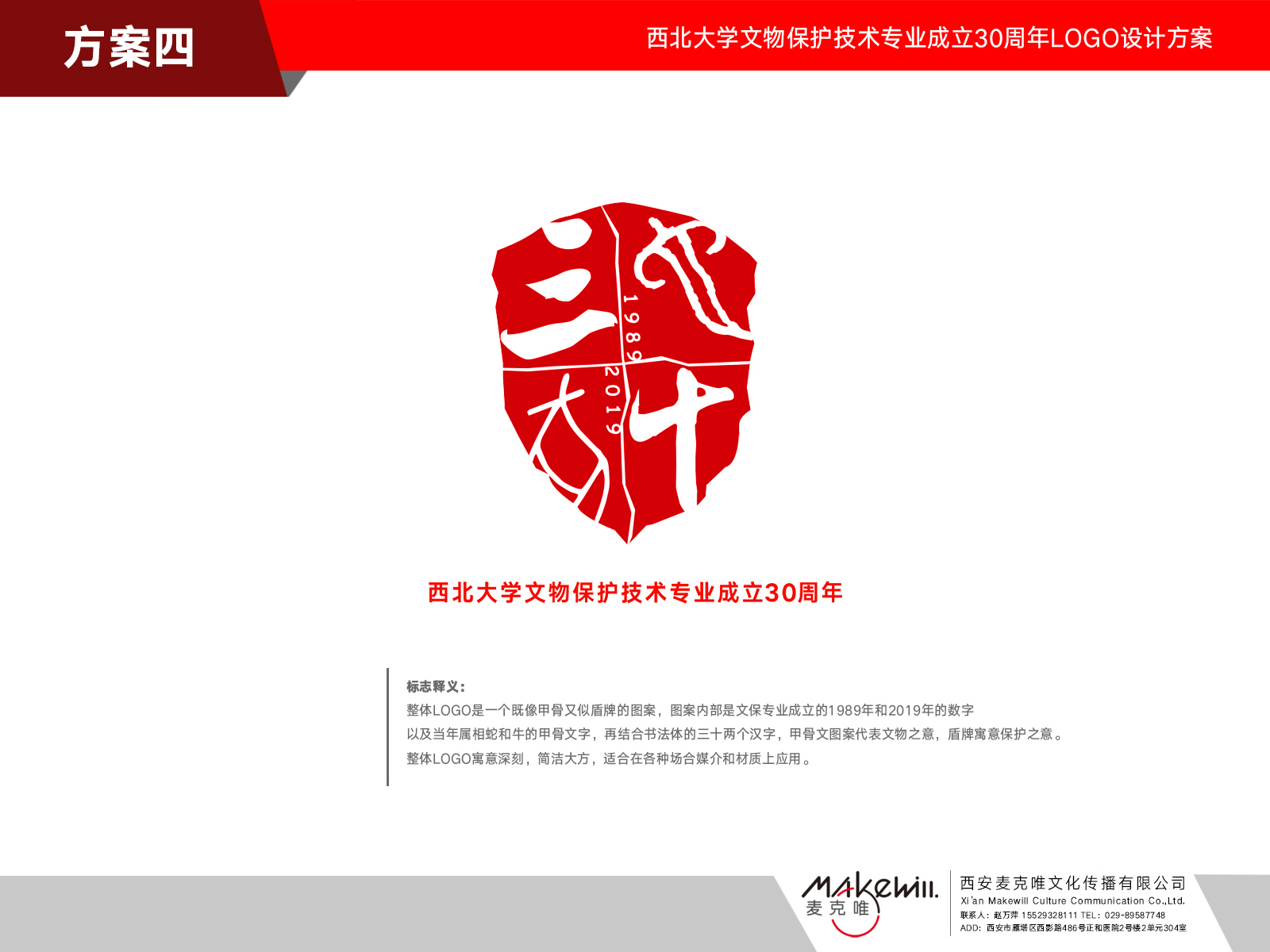 整体L0GO是一个既像甲骨又似盾牌的图案,图案内部是文保专业成立的1989年和2019年的数字以及当年属相蛇和牛的甲骨文字,再結合书法体的三十两个汉字,甲骨文图案代表文物之意,盾牌寓意保护之意。整体L0GO寓意深刻,简洁大方,适合在各种场合媒介和材质上应用。