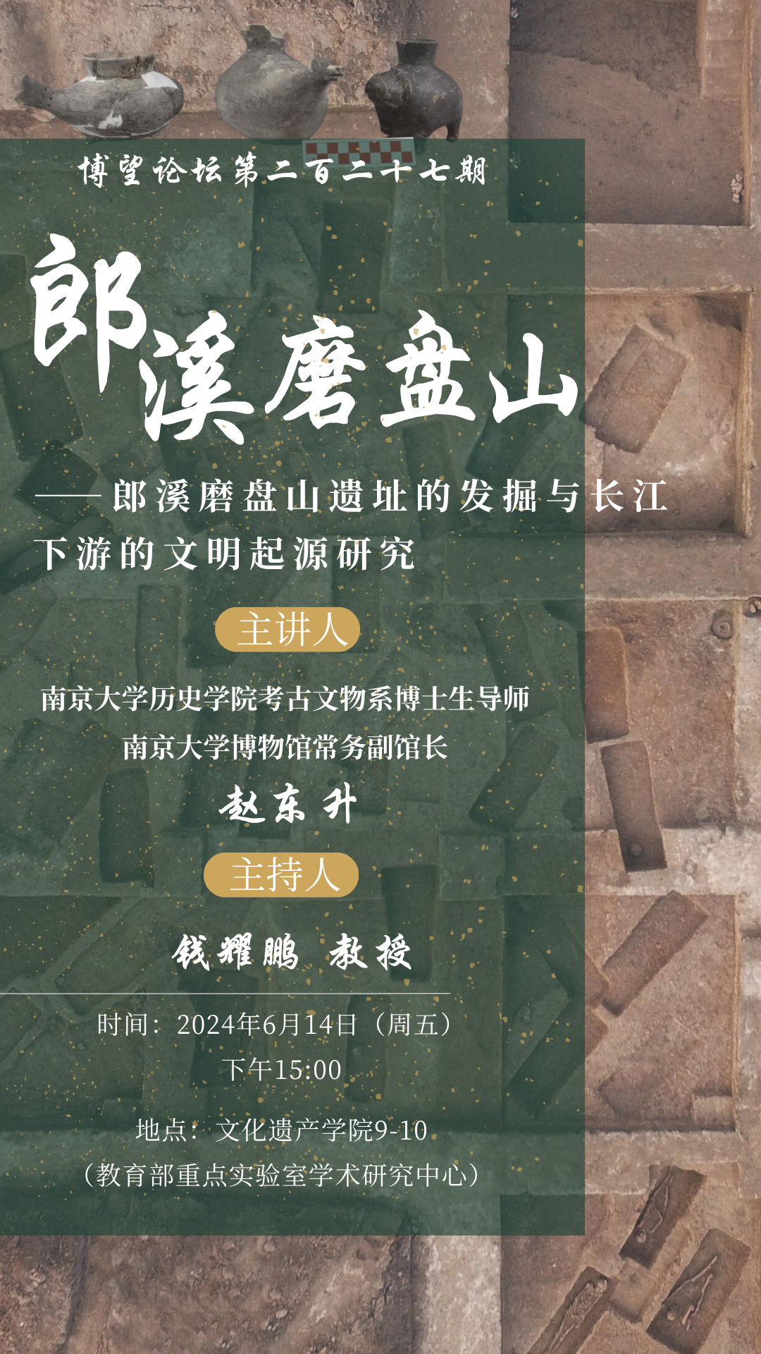 主讲人:赵东升,南京大学考古学博士毕业,现任南京大学历史学院考古文物系博士生导师,南京大学博物馆常务副馆长,水下考古研究中心主任,加州大学洛杉矶分校访问学者。主要研究南方先秦时期考古,在《考古》《文物》等期刊上发表40余篇学术论文,出版专著2部,合著5部。荣获江苏省教育厅哲学社会科学优秀成果奖。主持完成国家社科基金青年项目“青铜时代长江下游中原化进程研究”,主持在研国家社科基金重点项目“郎溪磨盘山遗址考古发掘资料整理与研究”。作为子课题负责人在研国家社科基金重大项目“长江下游社会复杂化及中原化进程研究”。主持的郎溪磨盘山遗址考古获评2023年度“中国十大考古新发现”。