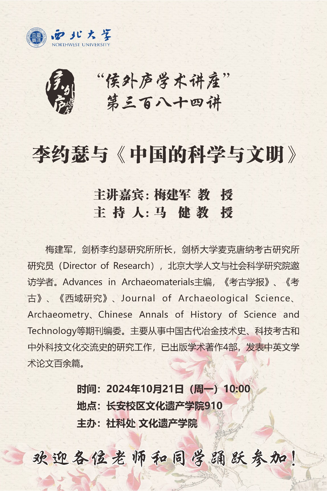 梅建军,剑桥李约瑟研究所所长,剑桥大学麦克唐纳考古研究所研究员(Director ofResearch),北京大学人文与社会永利集团院邀访学者。Advances in Archaeomaterials主编《考古学报》、《考古》、《西域 研 究》ScienceJournalArchaeologicalArchaeometry、Chinese Annalsof Historyof Science and Technology等期刊编委。主要从事中国古代冶金技术史、科技考古和中外科技文化交流史的研究工作,已出版学术著作4部,发表中英文学术论文百余篇